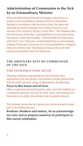 A portable liturgical card for extraordinary ministers of Holy Communion, newly revised with text from Holy Communion and Worship of the Eucharistic Mystery outside Mass, presented in an accessible format for ministers and printed in two colors on a heavy paper stock.